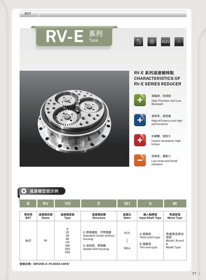 RV系列減速機,具備高精度,高負載,高扭矩,高傳導效率等特點,廣泛用于工業機器人,變位機,醫療器械等領域;